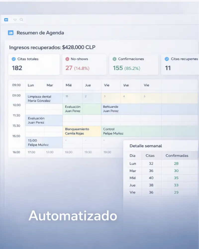 Automatizamos la reserva, confirmación y seguimiento de cada paciente para que tu agenda trabaje sola.